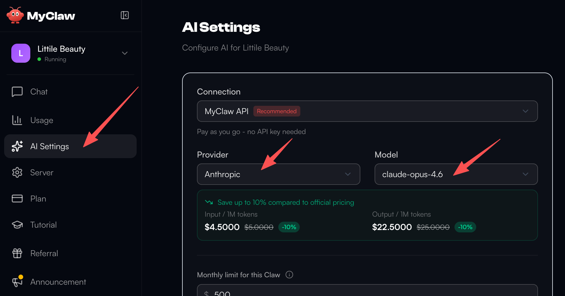 Once the server is back up, go to AI Settings in the sidebar and switch your primary model to Opus 4.6.