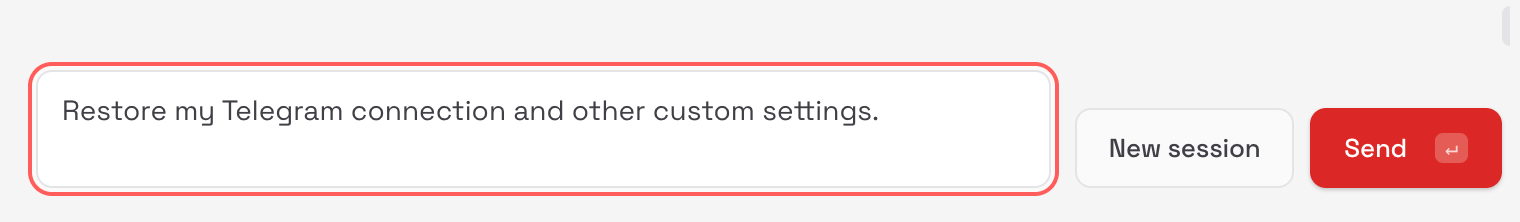 Send a message to your agent in the chat interface. Ask it to "Restore my Telegram connection and other custom settings." Opus 4.6 will quickly reconfigure your environment to your preferred state.